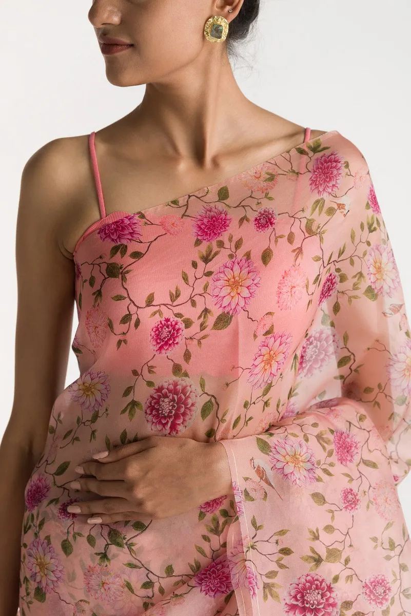 The Story of Dahlia & Sparrows-Peach Pure Organza Silk Saree